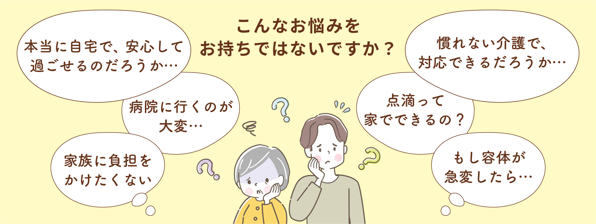 ご本人様も、ご家族様も、在宅療養には不安を感じるもの。だからこそ、私たちは双方の心の支えとなり、専門知識と温かいケアで安心して過ごせるよう精一杯お手伝いいたします。